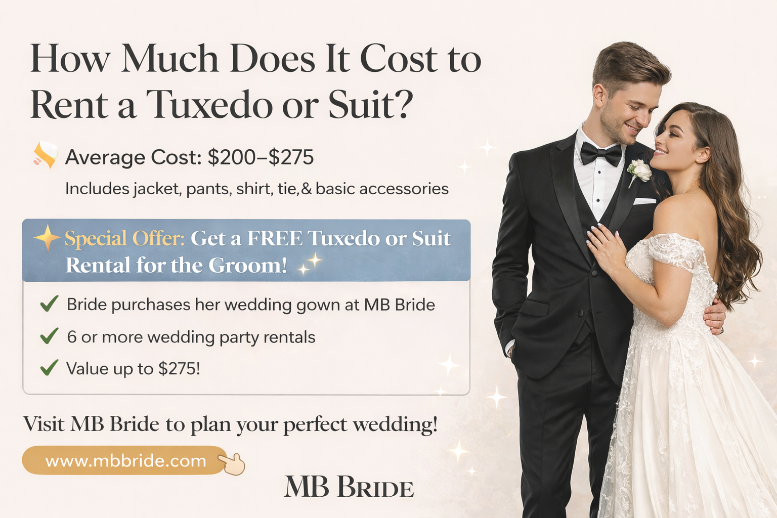 Renting a tuxedo or suit is a smart, stylish choice—and with MB Bride’s free groom rental offer, it’s an even better value 💰✨
