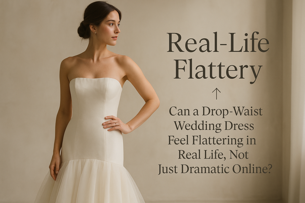 It also helps to try this shape with the wedding day in mind. A formal ballroom celebration may support more drama, while a garden, destination, or more relaxed venue may call for a lighter interpretation. The neckline, skirt volume, and fabric finish all affect whether the drop waist feels romantic, modern, or simply too sharp for the mood of the wedding.