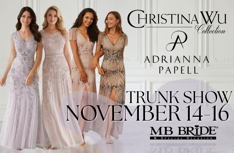 Celebrate in style with MB Bride during our Christina Wu & Adrianna Papell Mother of the Bride Trunk Show, happening November 14–16 in Greensburg, PA.